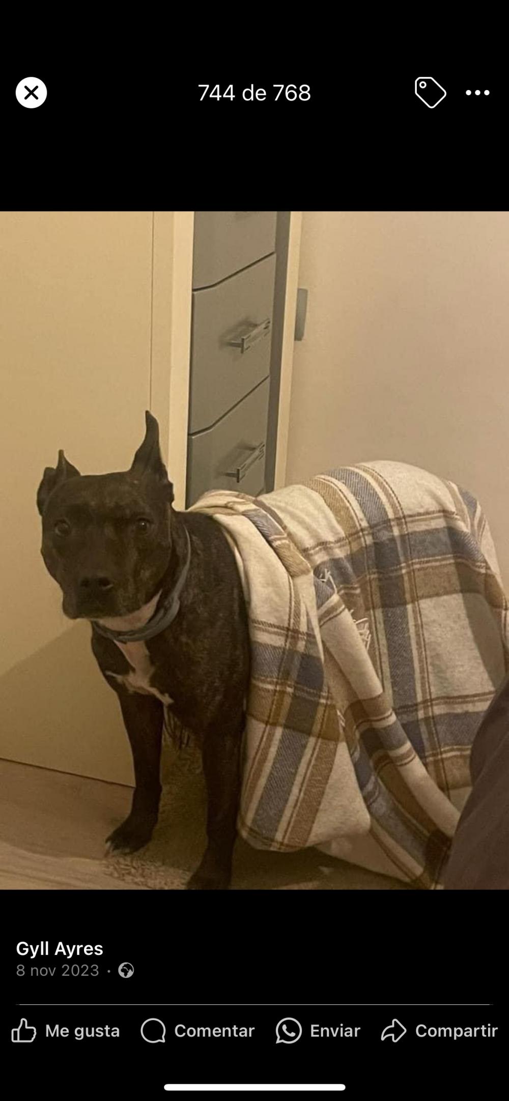 Luna está perdida desde el 12 de agosto de 2023,seguimos con esperanzas de poder encontrarla. Se perdió en el campo de Cerralba,podría estar por Álora,Pizarra,Coín,Cártama u alrededores,ya que ha pasado un año desde su pérdida. Es una mezcla de american y pitbull,es muy chica y delgada,por lo que la suelen confundir con un galgo,ahora podría estar más delgada aún dado el año sin ella,tiene 9 años actualmente;se perdió con 8. Cualquier información será agradecida. Inglés :Luna has bee