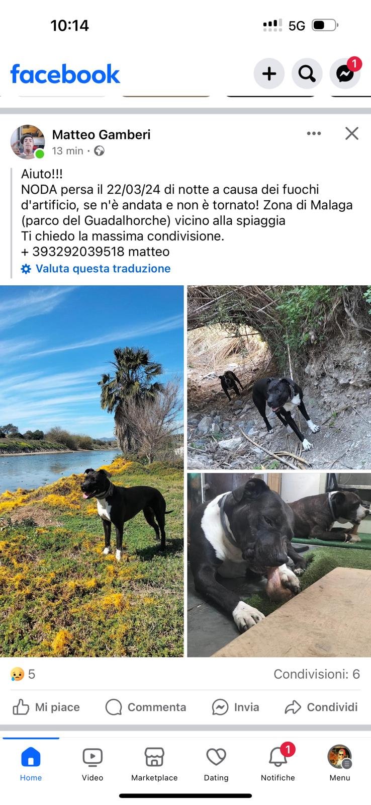 Parece un Pitbull mediano negro y blanco. Muy bonita, muy buena. Solo lleva el collar antipulgas. Tiene chip pero es italiano y desde España no se mirar.